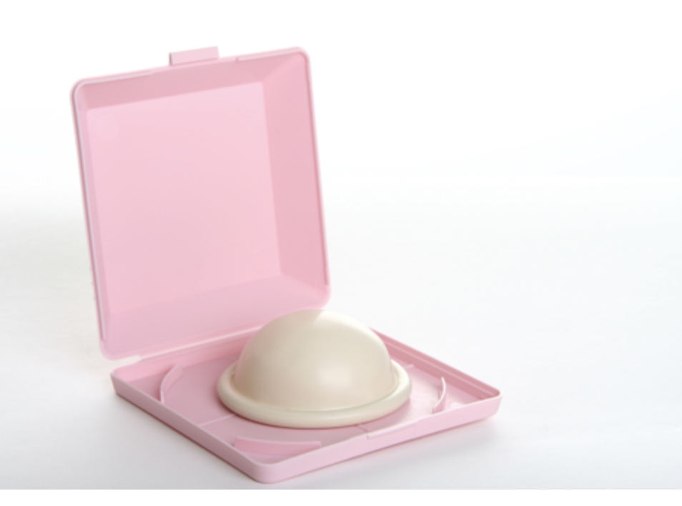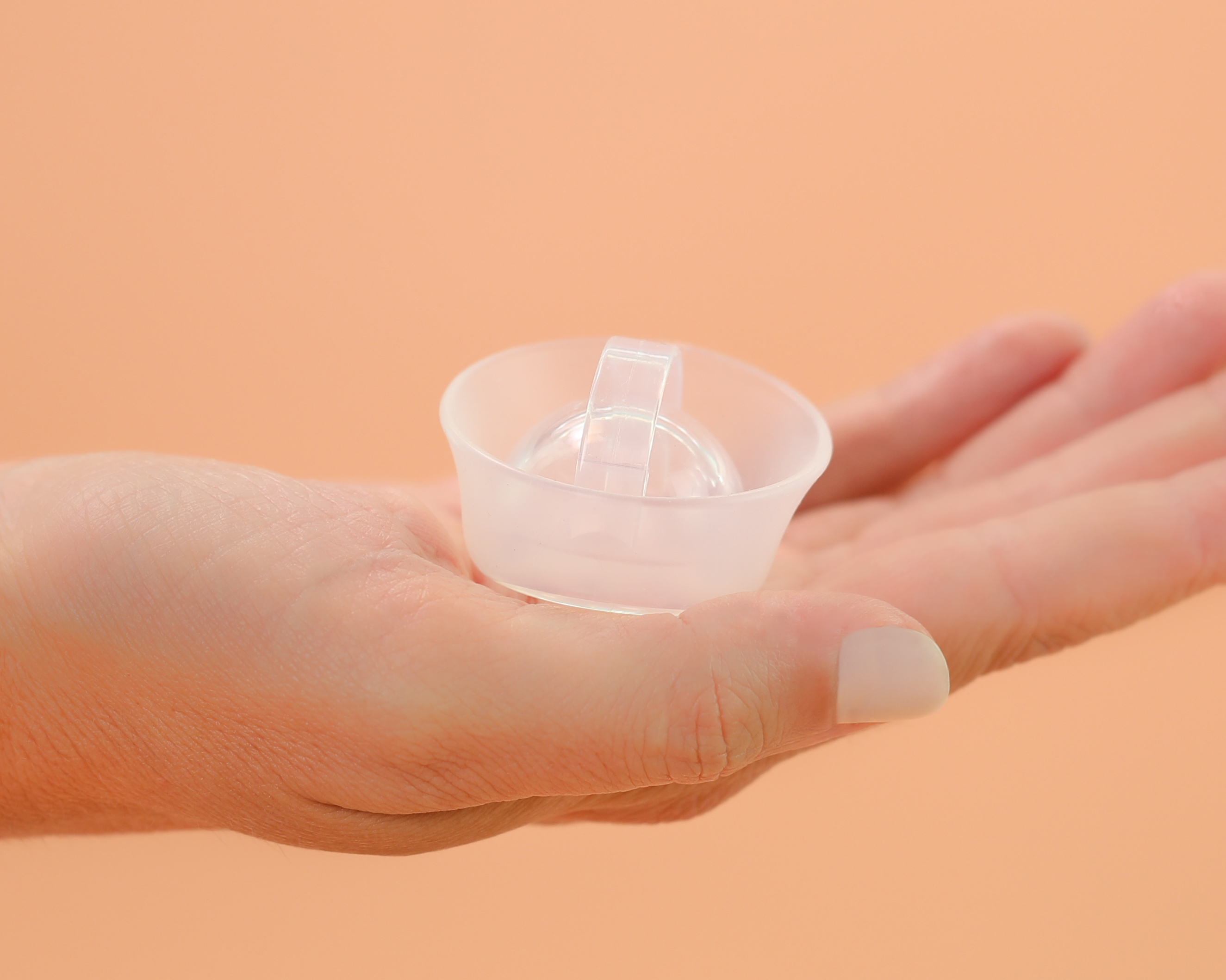 It’s smaller than a Diaphragm (and therefore less intimidating), and fits snugly around your cervix. The brim of this device forms a seal against the vaginal wall and acts as a funnel to direct semen into the groove. The groove acts as both a reservoir to contain Contraceptive Gel, and a trap for sperm to be neutralised. It has a clever strap that initially activates a vacuum seal over the cervix, then during the removal process, releases the suction for retrieval.